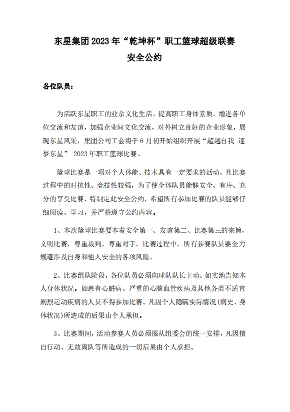 今天,小編懷著萬分激動的心情,帶著一條最新、最熱的重磅消息向您迎面走來… 一項能夠提高員工身體素質(zhì),增強(qiáng)團(tuán)隊凝聚力,活躍業(yè)余文化生活,增進(jìn)各單位交流和友誼的重要賽事——東星集團(tuán)2023年“乾坤杯”職工籃球超級聯(lián)賽(DXBA)開賽在即啦~~~ 本次籃球聯(lián)賽由集團(tuán)公司工會主辦,得到了集團(tuán)公司各級領(lǐng)導(dǎo),尤其是董事長、總經(jīng)理于大偉以及各參賽隊領(lǐng)導(dǎo)的大力支持。全集團(tuán)共有10支球隊、100名隊員參賽。目前,參賽球隊已通過抽簽的方式分為乾、坤組,小組循環(huán)賽后,每組前兩名的球隊將出線爭奪最終的冠、亞、季軍。 下面 大家快來跟我一起看看DXBA的賽程安排吧 注:如遇暴雨天氣或其他特殊原因無法比賽,時間另行調(diào)整。 集團(tuán)公司特制定了安全應(yīng)急預(yù)案確保本次籃球賽的順利進(jìn)行,預(yù)案結(jié)合醫(yī)療、安保、防暑降溫等各方面工作部署,全方位為賽事提供服務(wù)和支持。 1.集團(tuán)公司工會下發(fā)《安全公約》,各代表隊領(lǐng)隊進(jìn)行安全宣傳,明確職責(zé),熟悉內(nèi)容,切記安全第一、友誼第二、比賽第三的原則;各代表隊領(lǐng)隊在賽前需帶領(lǐng)球員熟悉場地和疏散路線圖;各領(lǐng)隊要安排專人為隊員準(zhǔn)備好防暑降溫飲品。 2.集團(tuán)公司生產(chǎn)管理部安排安全專員全程跟進(jìn)賽事,賽前認(rèn)真檢查比賽器械、場地和消防通道,維護(hù)賽場秩序,測量球員體溫,保證比賽安全。 3.東星醫(yī)院派出專業(yè)的醫(yī)護(hù)人員攜帶醫(yī)療器械配合比賽。醫(yī)護(hù)人員指導(dǎo)所有球員進(jìn)行抗原檢測,同時,準(zhǔn)備好氧氣袋和急救藥品以備不時之需。 4.比賽組委會隨時注意天氣變化,若有不適宜比賽的天氣,及時將順延、停賽等信息通知各參賽隊相關(guān)人員。 1.比賽過程中,各隊領(lǐng)隊必須到場,隨時維持現(xiàn)場秩序、做好應(yīng)急準(zhǔn)備。 2.各位球員必須嚴(yán)格遵守比賽規(guī)則,不得起沖突、尋釁鬧事,如有違反,嚴(yán)格按照《安全公約》中的規(guī)定給予罰下或取消比賽資格的處罰。 1.各隊負(fù)責(zé)維持好現(xiàn)場秩序,保證人員安全退場,避免發(fā)生碰撞。 2.各隊負(fù)責(zé)好場地的清理工作,帶走場地垃圾,保持東星集團(tuán)一貫以來良好的企業(yè)形象。 突破極限,超越自我,這是東星人在賽場上的最美姿態(tài),也是東星人飽含斗志、滿懷激情的宣言!在這個熱烈的夏天,隊員們將用一個個精彩瞬間展現(xiàn)東星人昂揚(yáng)向上的精神風(fēng)貌,讓我們拭目以待! 愿以這場籃球賽 紀(jì)念那些 過去的 再不回頭的 你的 我的 他們的 永恒的 青春 ……
