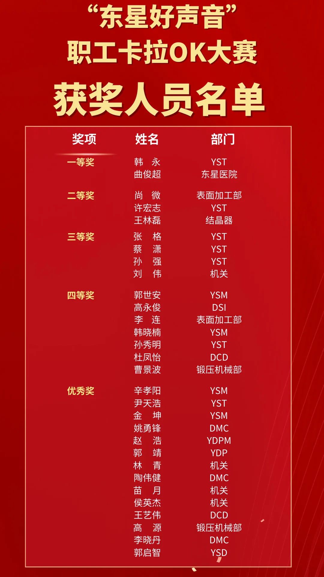 讓青春與熱情對話,讓歌聲與夢想放飛!為了打造健康文明、奮發(fā)昂揚(yáng)的企業(yè)文化氛圍,豐富員工們的業(yè)余文化生活,深入挖掘集團(tuán)公司優(yōu)秀藝術(shù)人才,展現(xiàn)東星職工的個人魅力與風(fēng)采,8月27日下午14:30,伴隨著動感的音樂和燈光秀,“東星好聲音”職工卡拉OK大賽決賽在煙臺開發(fā)區(qū)萬行廣場盛世華堂宴會酒店激情開唱。集團(tuán)公司副董事長、副總經(jīng)理厲強(qiáng),副總經(jīng)理王建全,總經(jīng)理助理宮明杰以及集團(tuán)本部各單位和各長投單位的主管領(lǐng)導(dǎo)觀看了比賽。煙臺首鋼豐田工業(yè)空調(diào)壓縮機(jī)有限公司總經(jīng)理渡邊靖也親臨比賽現(xiàn)場為選手們加油助威。 本次大賽歷時近一個月的時間,共有來自15個單位的57名選手參加了海選。8月12日,集團(tuán)公司工會在機(jī)關(guān)二樓會議廳組織了預(yù)選賽,在預(yù)賽的30名選手中,評選出16名晉級決賽。為了體現(xiàn)公開、公平、公正的辦賽原則,決賽特邀了5位在國家級、省市級各項音樂賽事中獲獎的專業(yè)評委現(xiàn)場在線評分,同步上傳至大屏幕,使參賽選手和觀眾們能夠第一時間了解到每位選手的得分情況。 音樂沒有國界,它可以穿越時空,跨越年代。在比賽現(xiàn)場,選手們的演唱曲目豐富多彩,從90年代的《新不了情》《刀劍如夢》到如今的當(dāng)紅流行歌曲《光年之外》《最美的太陽》;從唱出一名軍嫂內(nèi)心故事的《妻子》到鼓舞人心、令人向上的英文歌曲《You Raise Me Up》;從獨(dú)唱到樂隊伴奏演唱……選手們的表演風(fēng)格各異,精彩紛呈,不同時代的音樂就像時光穿梭機(jī),帶領(lǐng)大家重溫經(jīng)典,感受時代的變遷。 鍛壓機(jī)械部 曹景波 《感謝》 表面加工部 李連 《站在草原望北京》 結(jié)晶器 王林磊 《最美的太陽》 YSM 韓曉楠 《終于等到你》 YSM 郭世安 《海闊天空》 YST 張格 《新不了情》 表面加工部 尚微 《妻子》 YST 蔡瀟 《刀劍如夢》 DCD 杜鳳怡 《恰似你的溫柔》 YST 孫秀明 《故鄉(xiāng)》 YST 許宏志 《領(lǐng)悟》 機(jī)關(guān) 劉偉 《YOU RAISE ME UP》 DSI 高永俊 《我是真的愛上你》 東星醫(yī)院 曲俊超 《千百年后誰還記得誰》 YST 孫強(qiáng) 《光年之外》 YST 韓永 《天邊》 最終,來自YST的韓永和東星醫(yī)院的曲俊超獲一等獎;尚微、許宏志、王林磊獲二等獎;張格、蔡瀟、孫強(qiáng)、劉偉獲三等獎;郭世安等7名選手獲四等獎;晉級預(yù)賽的辛孝陽等14名選手獲優(yōu)秀獎。出席活動的領(lǐng)導(dǎo)給獲獎選手們頒獎并合影留念。