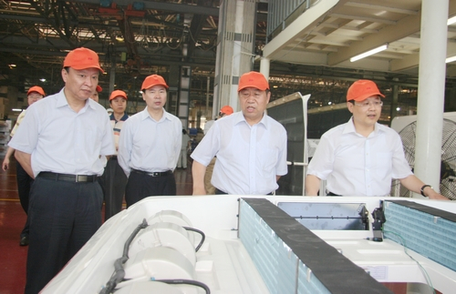 在YSD車用空調(diào)生產(chǎn)現(xiàn)場,王市長聽取了東星集團董事長、總經(jīng)理杜寶棟關(guān)于企業(yè)發(fā)展情況和車