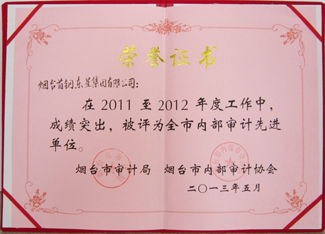 近日,我公司由于內(nèi)審工作成績突出,被煙臺市審計局、煙臺市內(nèi)部審計協(xié)會評為2011至2012年度全市內(nèi)部審計先進(jìn)單位。