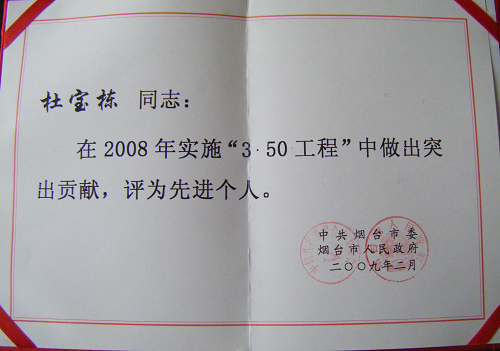 程”先 進集體榮譽稱號,董事長杜寶棟被評為實施“3.50工程”先進個人。