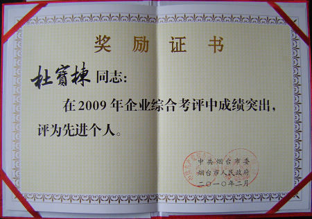 勵。 我公司憑借優(yōu)異的經(jīng)營業(yè)績,在“企業(yè)綜合考評先進(jìn)集體和先進(jìn)個人”獎項(xiàng)中,被煙臺市委、市政