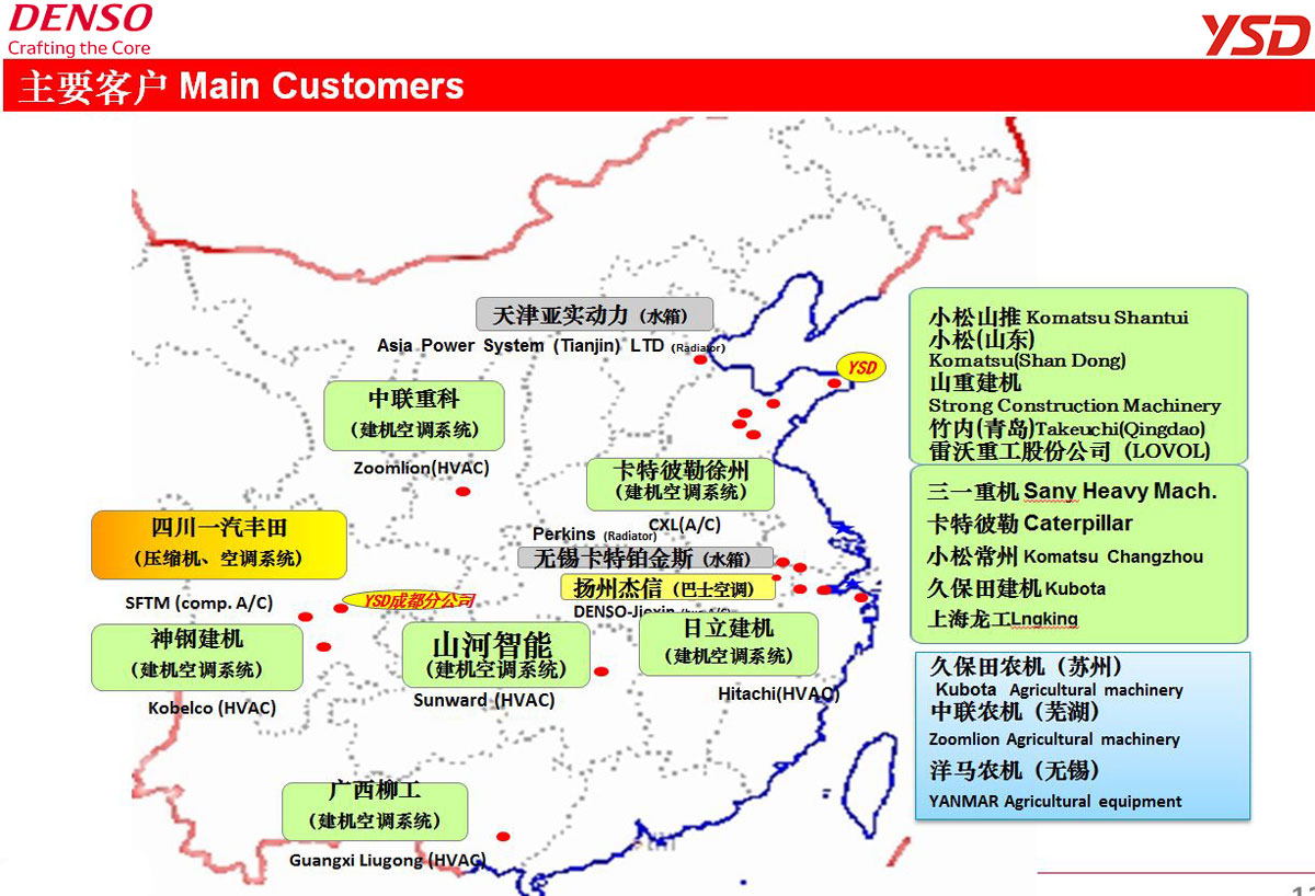 煙臺(tái)首鋼電裝有限公司(簡(jiǎn)稱:YSD)是株式會(huì)社電裝與首鋼集團(tuán)有限公司共同出資創(chuàng)建的汽車零部件企業(yè),成立于1994年12月,是株式會(huì)社電裝在中國(guó)的第一家合資公司。公司投資總額為40億日元,注冊(cè)資本13.49億日元。主要生產(chǎn)、研究開發(fā)并銷售轎車、建機(jī)、通訊基站、農(nóng)機(jī)用空調(diào)全系統(tǒng)和水箱及其部品。目前YSD擁有員工257名(截止2013年7月),年銷售額4個(gè)億,主要客戶豐田、本田、卡特彼勒、小松、三一、巴士等廠家。公司從1997年起,相繼通過ISO9001質(zhì)量管理體系、ISO14001環(huán)境管理體系、IATF16949質(zhì)量管理體系,OHSAS18000職業(yè)健康與安全管理體系的認(rèn)證。
